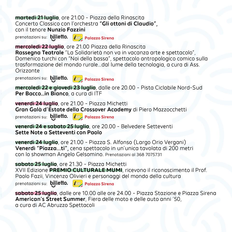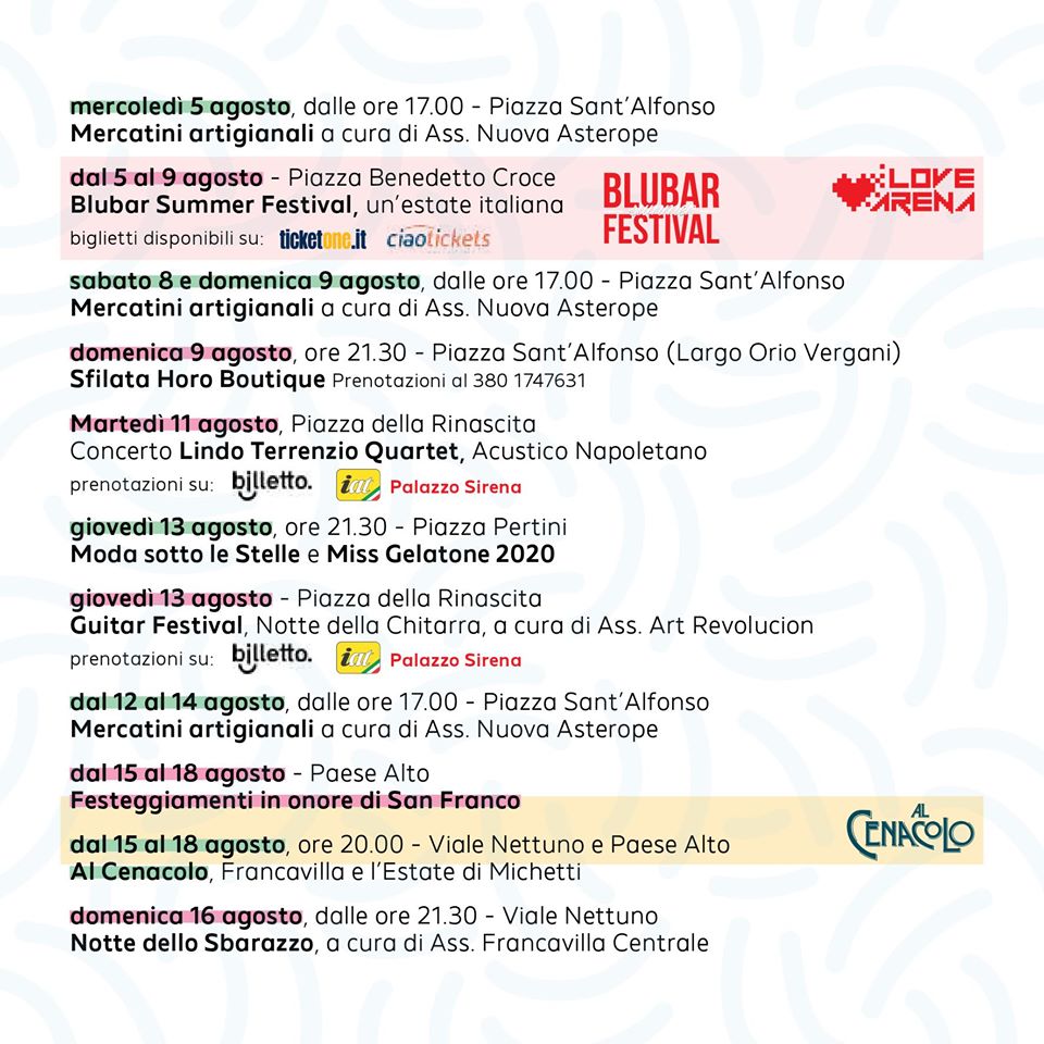 Il Programma Estivo 2020 sarà ricco di spettacoli artistici e musicali, con la partecipazione di Personaggi del calibro di Anna Foglietta, Lino Guanciale, le dolci melodie di Giovanni Allevi e le calde serate del Blubar Festival.